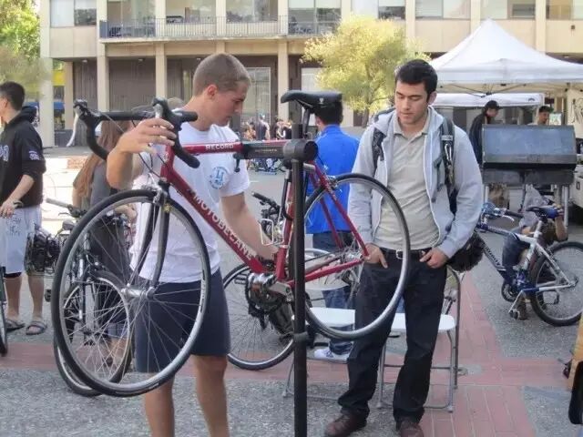 另一個小組的方法更簡單。他們在學生宿舍前面支了一個攤位,免費檢測自行車輪胎的氣壓,如果輪胎需要充氣的話,就收取1美元的費用。