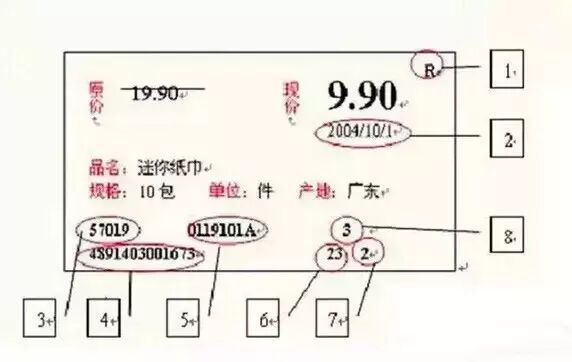 6標(biāo)示的是本商品在貨架上的第幾個(gè)位置,7標(biāo)示的是該商品有幾個(gè)排面,8標(biāo)示該商品在貨架的第幾層。物價(jià)標(biāo)簽只要表明價(jià)格不就可以了嗎?為什么要搞得如此復(fù)雜?